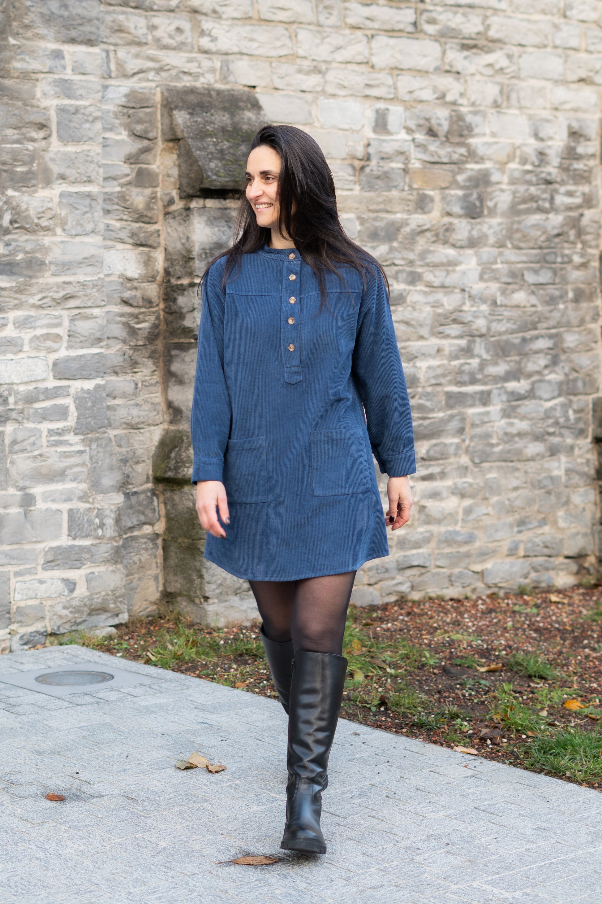 Deze jurk draag je gemakkelijk tijdens koele dagen. Je draagt er gemakkelijk een dun truitje onder. Afgewerkt met gouden knoopjes die zorgen voor een elegante look.