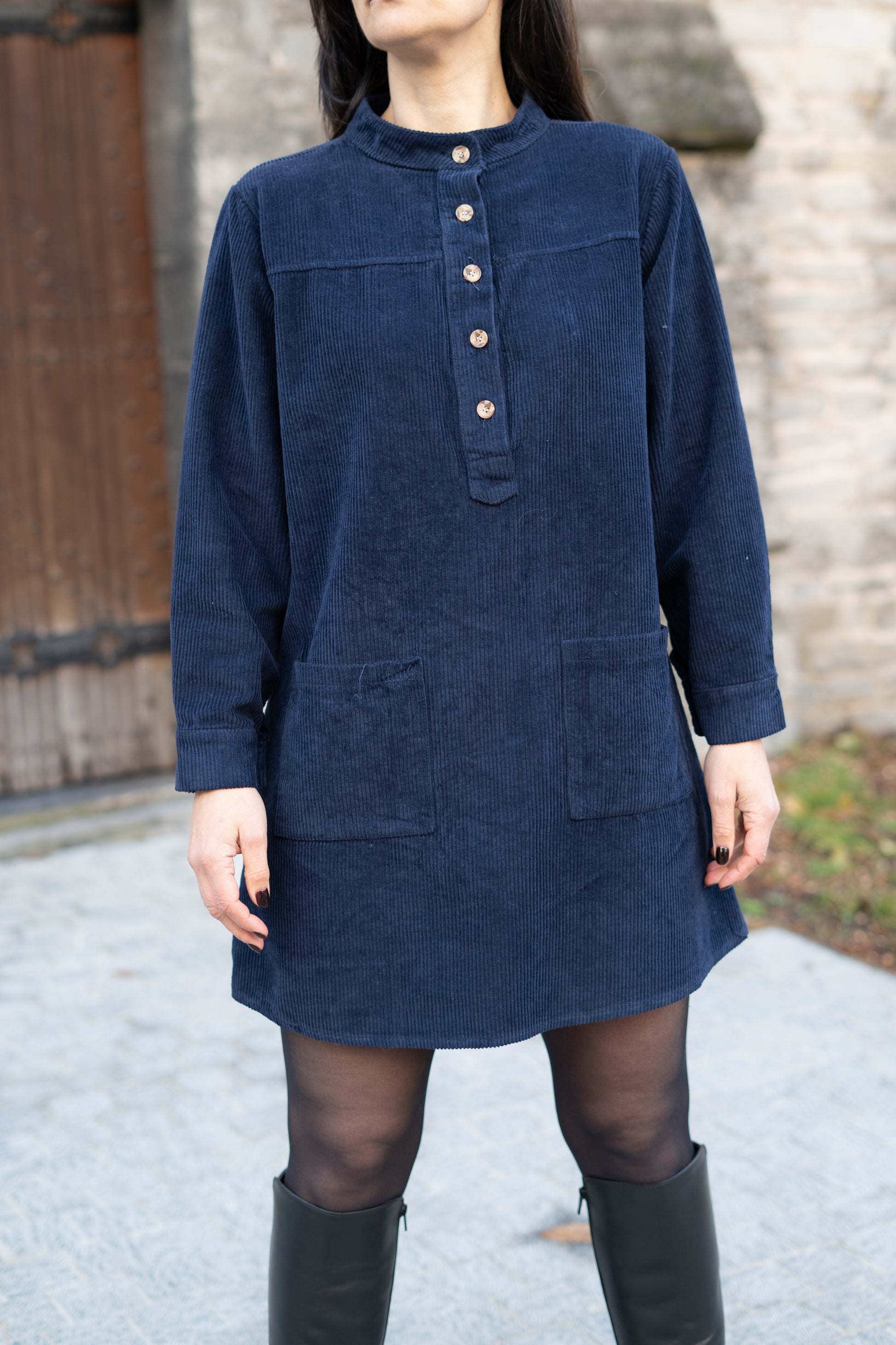 Deze jurk draag je gemakkelijk tijdens koele dagen. Je draagt er gemakkelijk een dun truitje onder. Afgewerkt met gouden knoopjes die zorgen voor een elegante look.