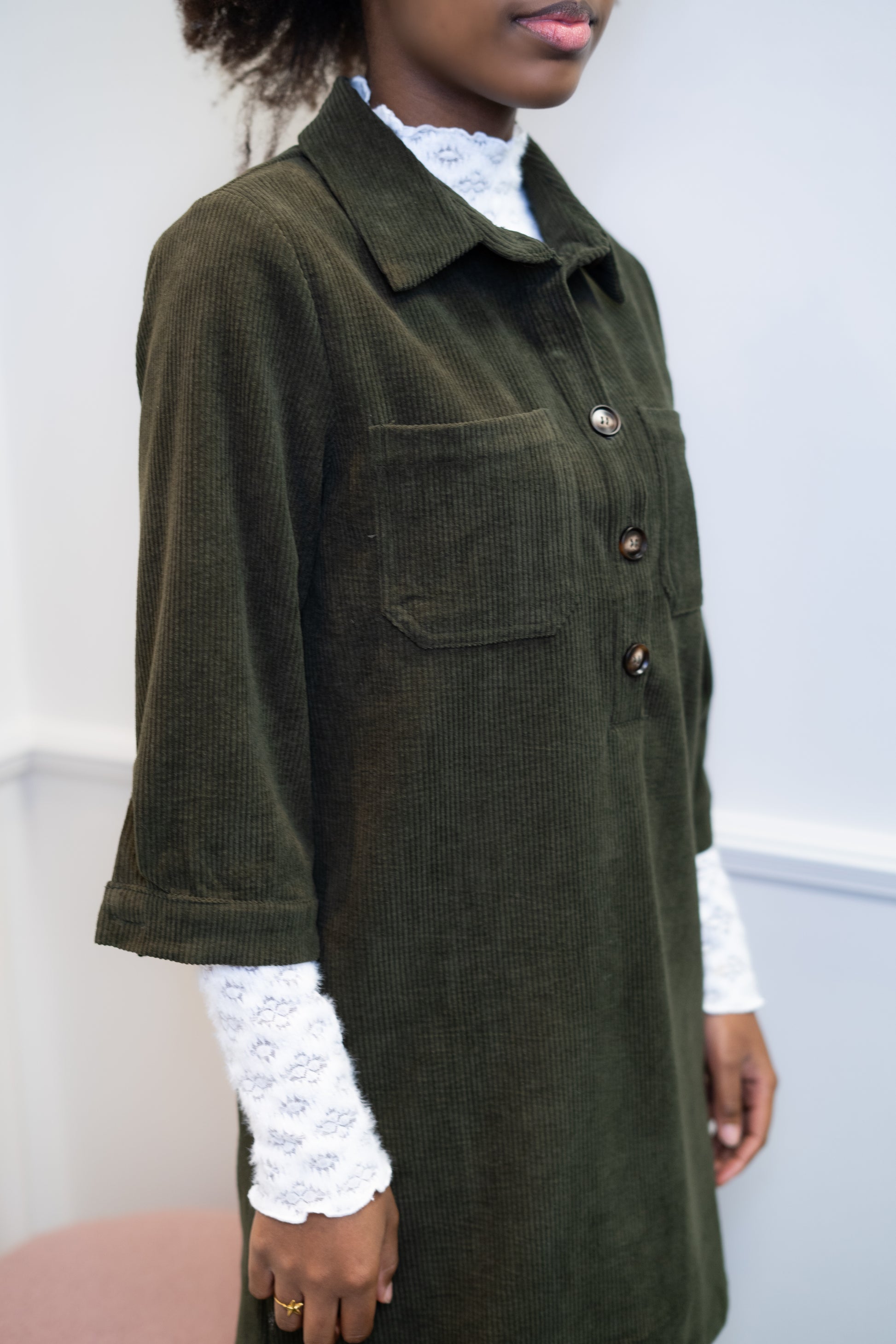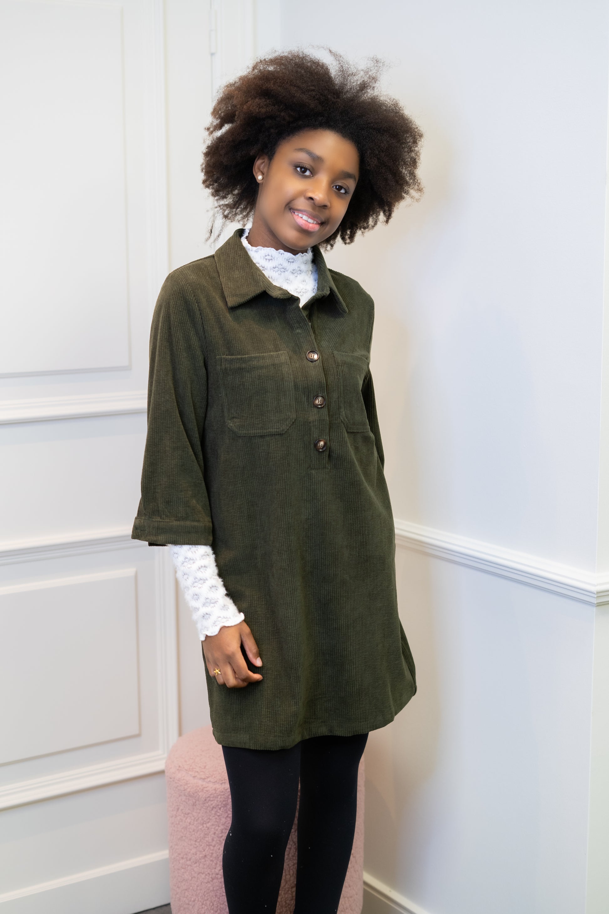 Deze jurk draag je gemakkelijk tijdens koele dagen. Je draagt er gemakkelijk een dun truitje onder. Afgewerkt met gouden knoopjes die zorgen voor een elegante look.